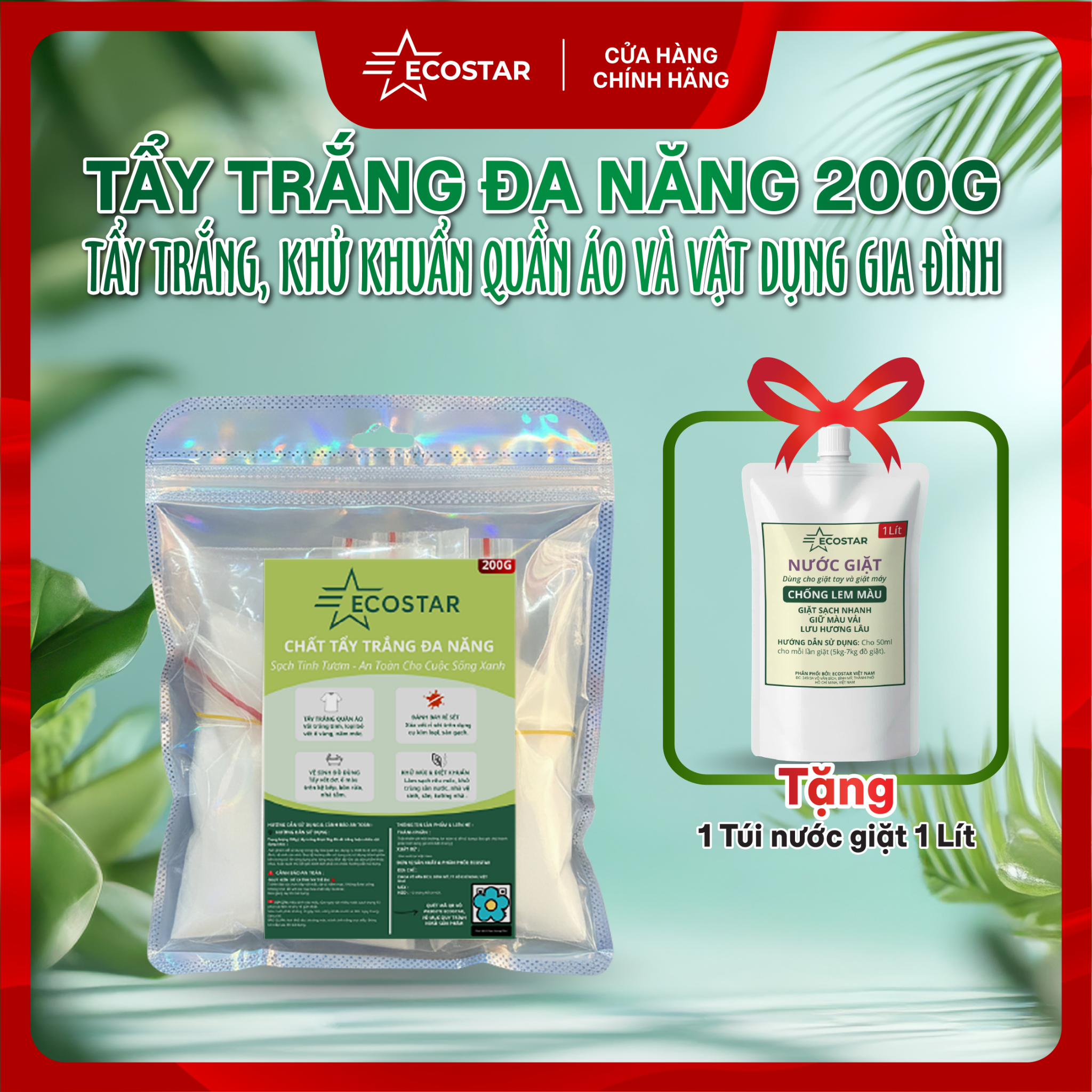 Tẩy Trắng Đa Năng Ecostar 1 Gói Tặng 1 Túi Nước Giặt 1L | Làm Sạch & Bảo Vệ Quần Áo – Giặt Đồ Không Lem Màu
