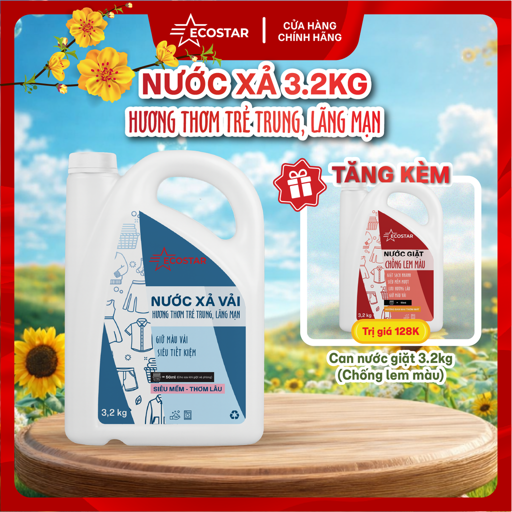 Sở hữu ngay bộ đôi "quyền năng" từ Ecostar: Một can Nước xả vải 3.2kg (Hương Trẻ trung, Lãng mạn) tặng kèm một can Nước giặt 3.2kg (Chống lem màu) trị giá 128K. Tổng cộng bạn nhận về 6.4kg sản phẩm cao cấp cho cả gia đình!